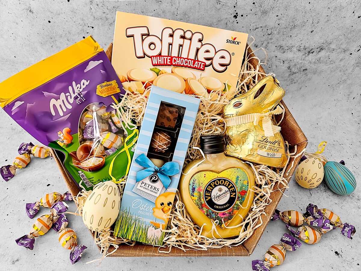 Du bist auf der Suche nach einem Osterkorb, gefüllt mit süßen Köstlichkeiten für Erwachsene? Bei der Ostereier-Suche geht es vor allem um Überraschungen. Dieses Osterkörbchen besticht mit zart schmelzender Schokolade in Kombination mit köstlichem Eierlikör für erwachsene Genießer. Genug für die ganze Familie oder mehr als genug für eine Person, die du ganz besonders schätzt!